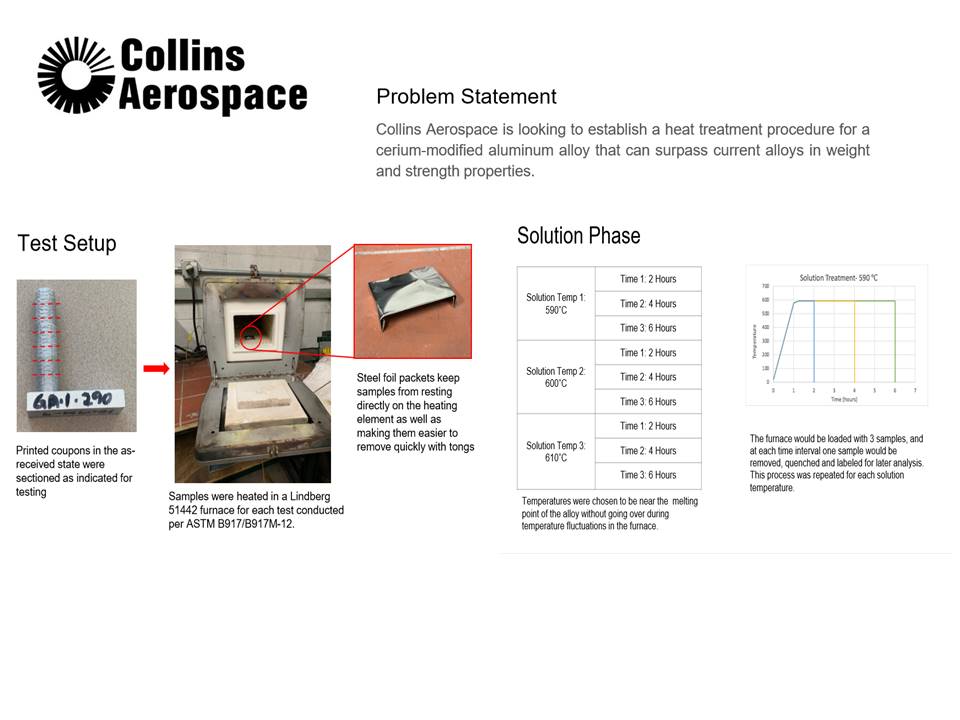 Project Overview: The aerospace industry is exploring the use of additive materials (Metal Matrix Composites) in the aircraft manufacturing process. Collins Aerospace has a new nickel-based super Aluminum Alloy that possesses high strength properties and resistance to elevated temperatures. During additive manufacturing (powder metallurgy) one step is Sintering. Sintering is the process of compacting and forming a solid mass of material by heat or pressure without melting it to the point of liquefaction. The objective and goal of this project is to explore the sintering process (heat treatment) to yield the best final materials properties. The team will study the alloy’s heat treating curves and solution treatment cycle to design possible heat treatment options. The team will develop and validate a repeatable and controlled procedure producing a desirable microstructure. The team will utilize a sintering furnace, SEM, optical microscopy, hardness and tensile testers.