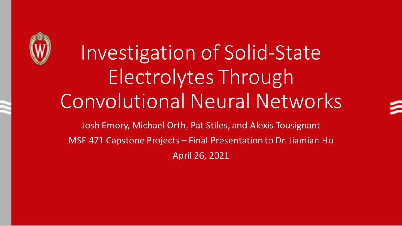 Project Overview: Solid electrolytes are the next frontier in battery technology however, due to their complex design, their fabrication is costly. This provides a hurdle in the study of this class of materials, as even measuring conductivity of a novel material requires fabrication which is slow and expensive. Computational Materials modeling is an emerging field of materials science that seeks to address these issues by creating tools to accurately predict the properties of novel new age materials such as solid electrolytes and allow researchers to screen material before allocating capital to their fabrication. The project team will be generating data via physical material modeling from known solid electrolytes to train convolutional neural networks to predict the conductivity of these materials, with the objective of creating a neural network the can accurately and robustly predict the conductivity of solid electrolytes. The project will run phase field simulations using UW-Madison’s Center for High Throughput Computing (CHTC) and the CNN Python code (with Google Colaboratory tool) to help disseminate machine learning.
