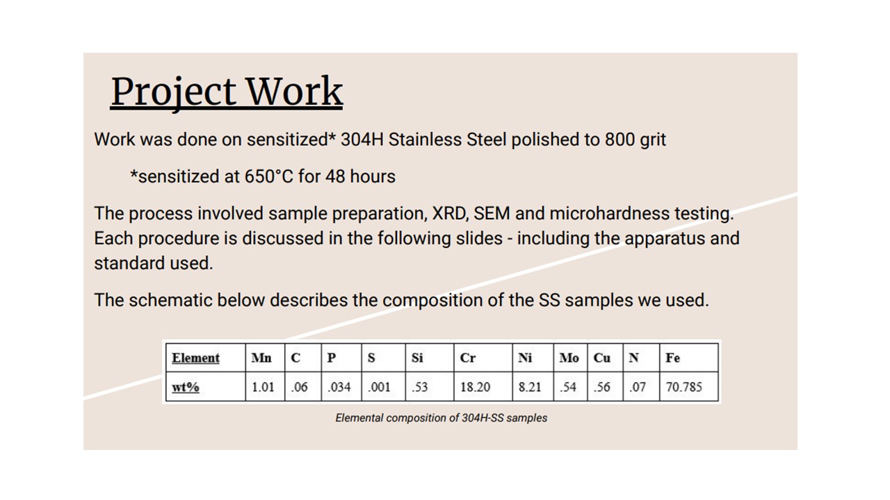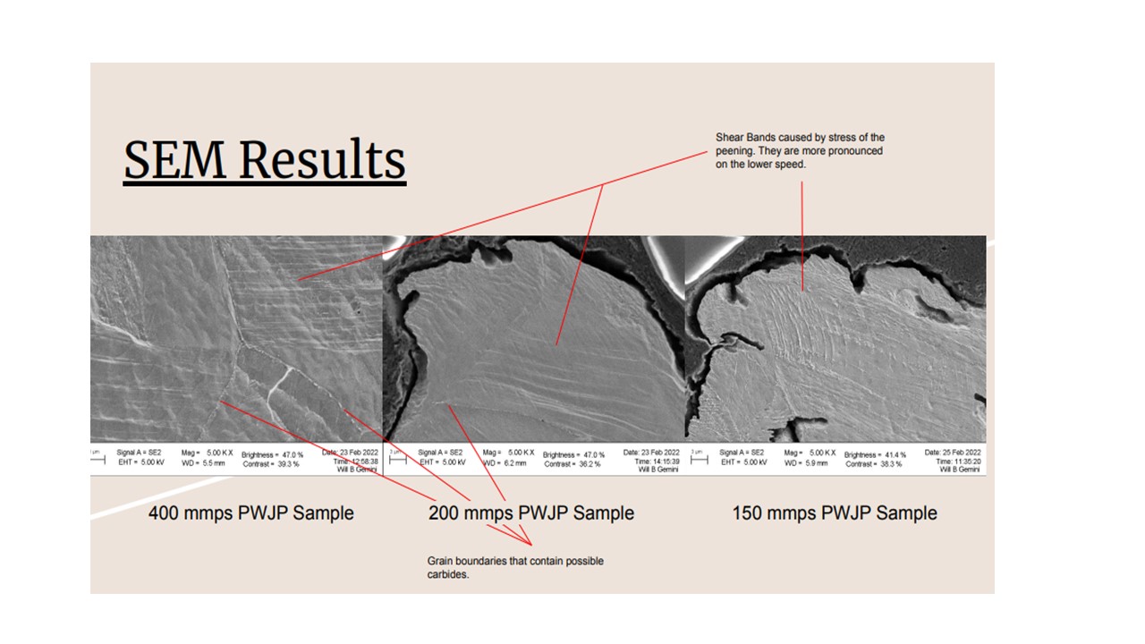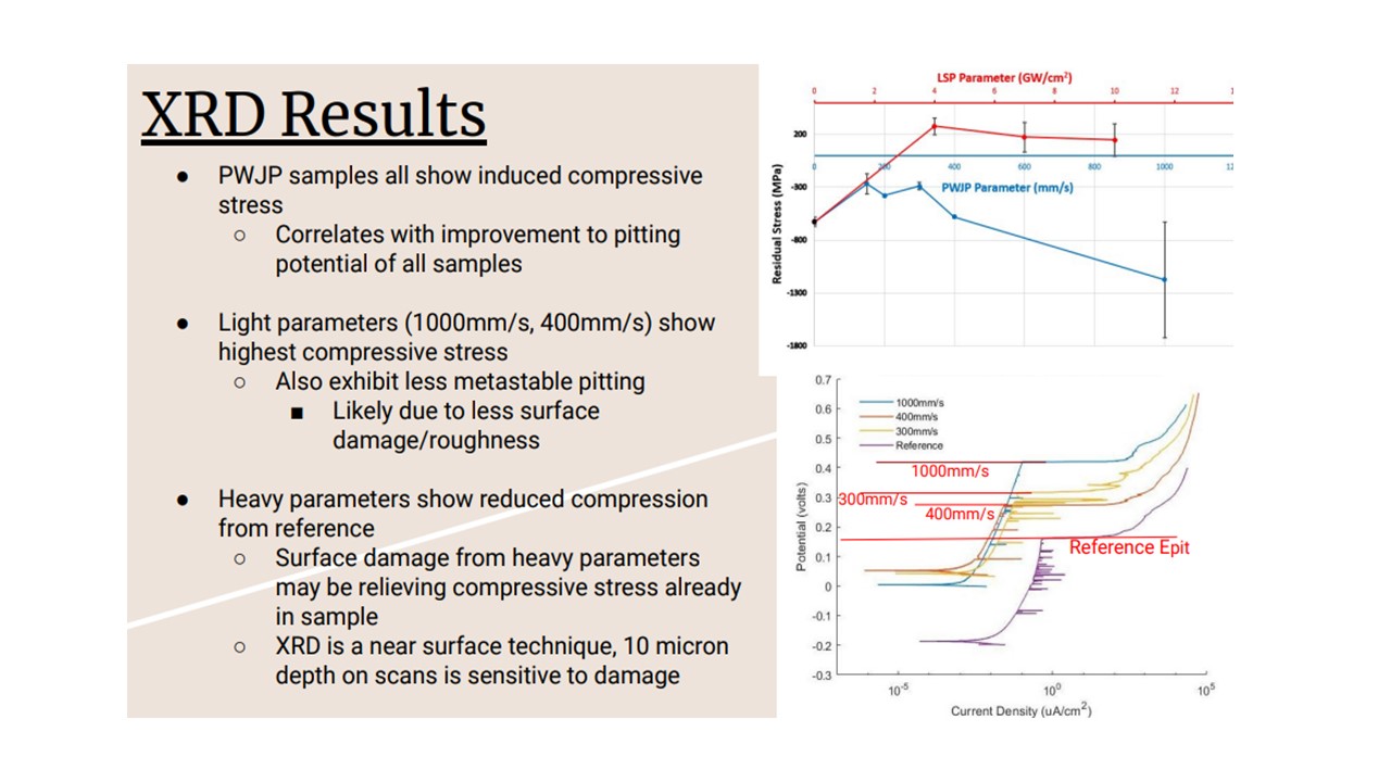 Project Overview: Long term storage of spent nuclear waste is an integral part in the lifecycle of materials related to nuclear power production; the containment of this radioactive material for time periods on the scale of decades is paramount to the safety of the public and environment. Dry Cask storage is the contemporary solution to this problem, which involves storing the waste in a stainless-steel cask. Over time the welded regions of theses casks corrode, can undergo corrosion from the corrosive species in the environment leading to the possibility of stress corrosion cracking which can compromise the integrity of the container and release its hazardous contents to the environment. An innovative new approach to mitigate stress corrosion cracking (SCC) is the use of surface peening to induce compressive residual stress to heal sites of SCC and mitigate future SCC proliferation. A variety of peening technologies including laser peening, water jet peening, and ultra-nanocrystalline surface modification are being investigated. This project will focus on residual stress measurements of samples peened by different technologies and supported by microstructure and property evaluations with techniques including SEM, XRD, EDS, and microhardness evaluations.