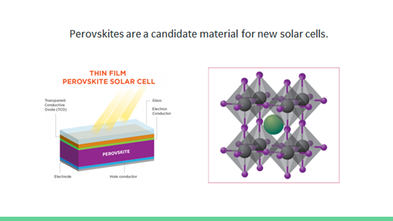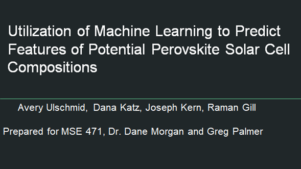 Project Overview: Perovskites structured compound, most commonly a hybrid organic-inorganic lead or tin halide-based material, are being investigated as an alternative to silicon solar cells. They have unique electronic properties that have the potential to be more efficient than existing solar cells. By altering the composition of a perovskite crystal structure, the properties of the material change. This project will use machine learning and Density Functional Theory (DFT) generated data to fit a model with the goal of finding an ideal composition subspace with promising stability and bandgap. The team will use machine learning mythology to improve experimental error bounds. The team will use the Materials Simulation Toolkit for Machine Learning (MAST-ML) to create machine learning model fits.